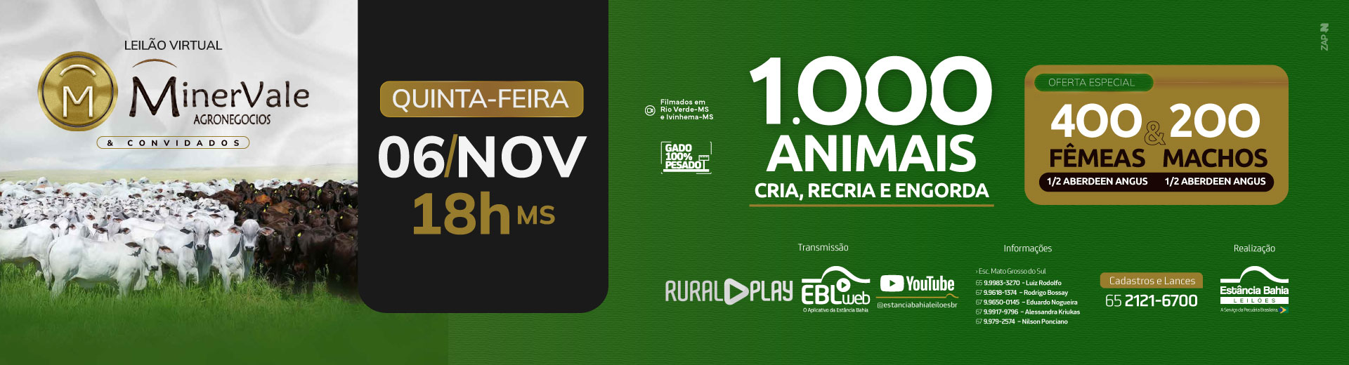 Oferta de 1.000 animais e oferta especial de 400 fêmeas e 200 machos 1/2 aberdeen angus.